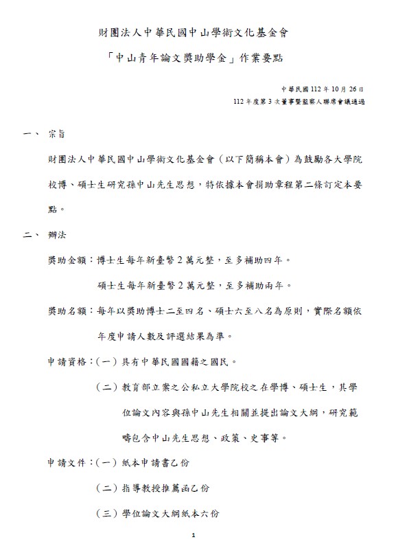 中山青年論文獎助學金作業要點